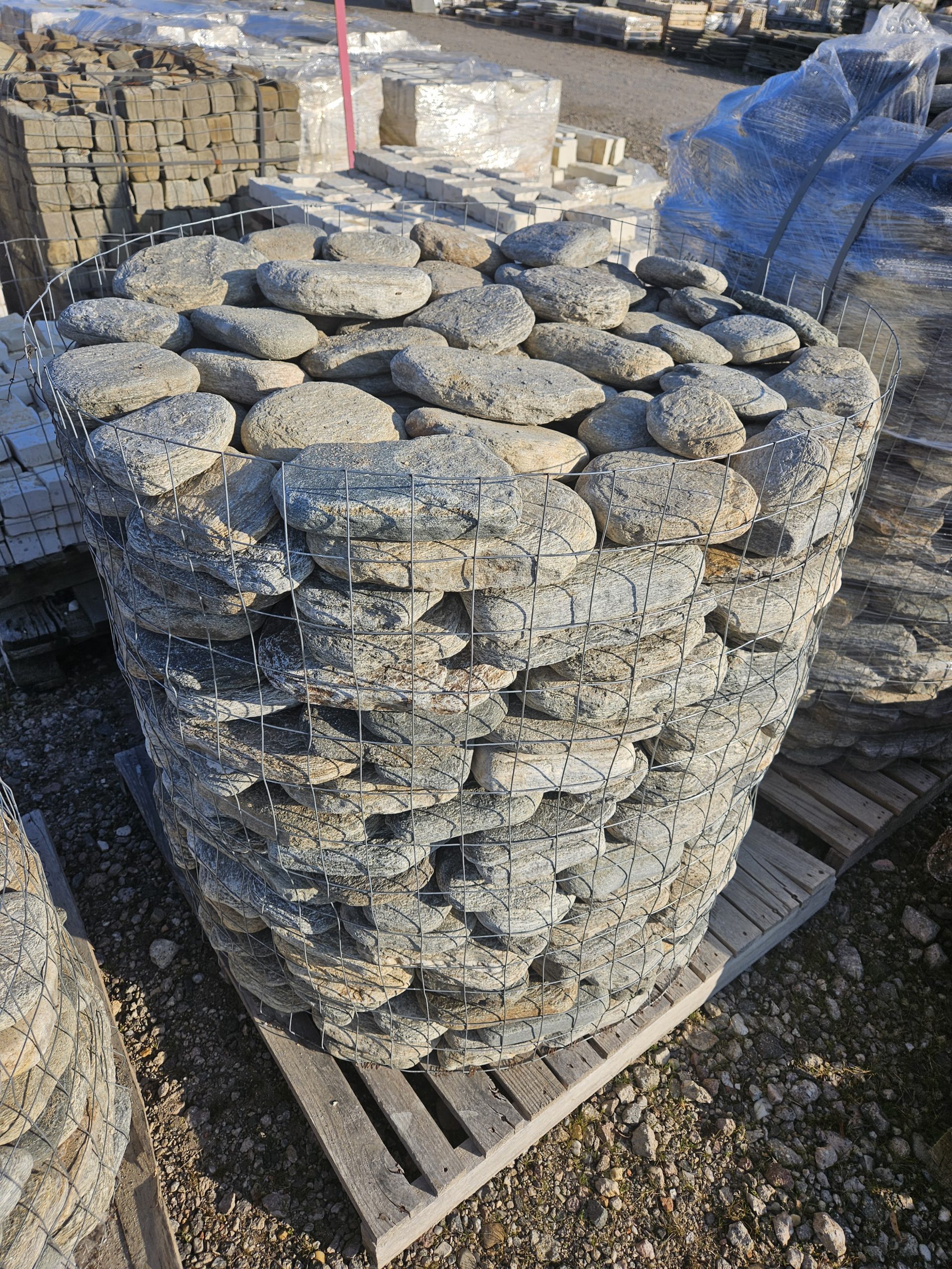 Die flachen Flusssteine kommen in einer Gitterbox zu ca. 800kg