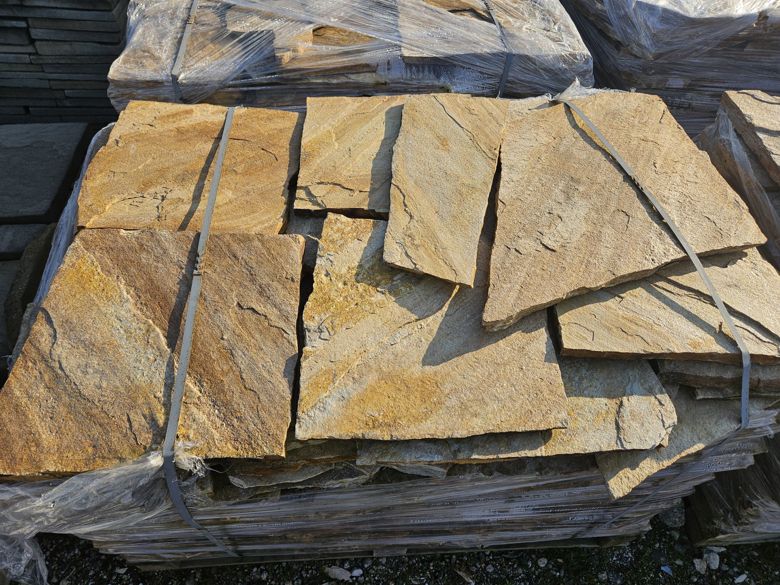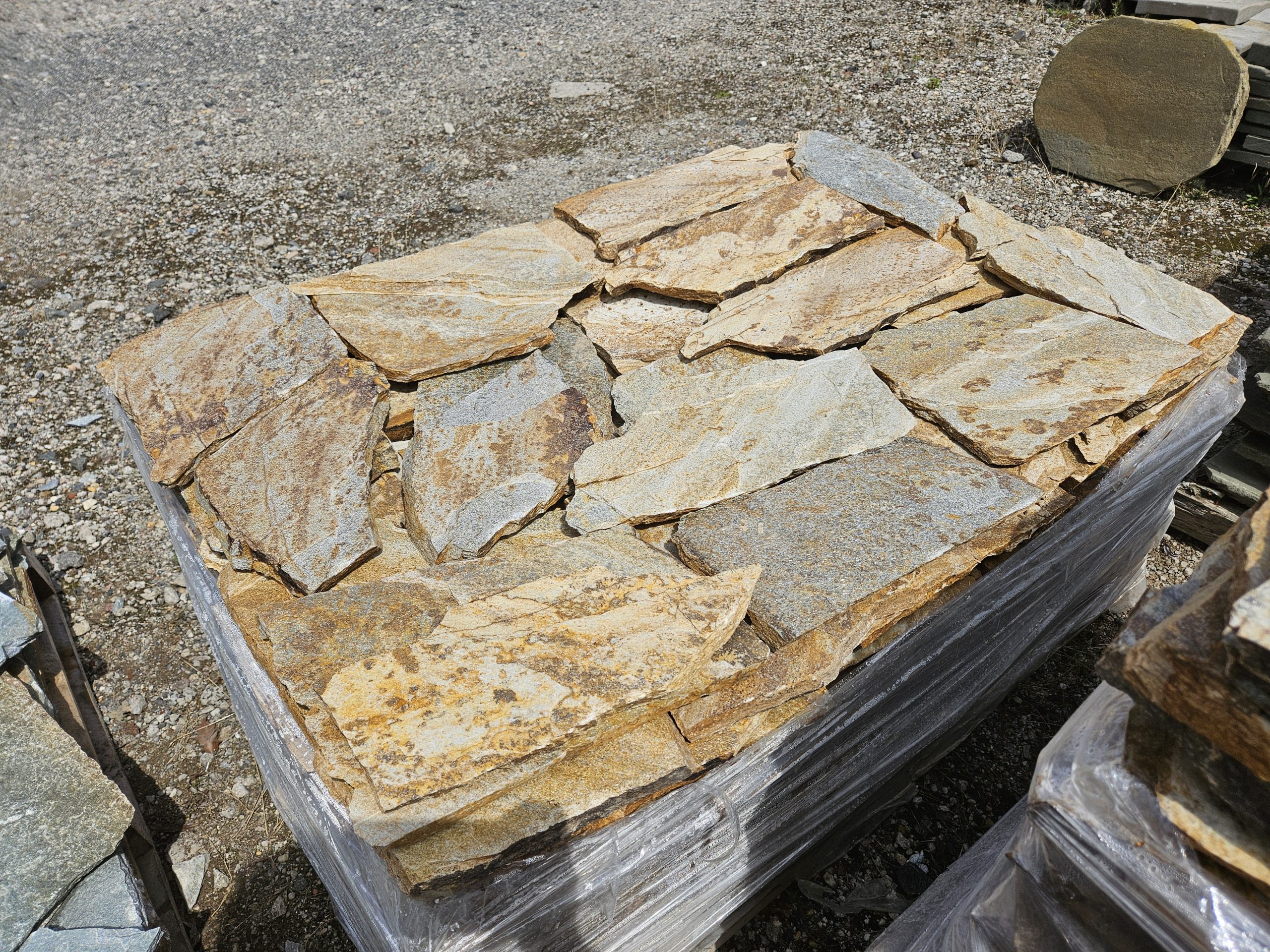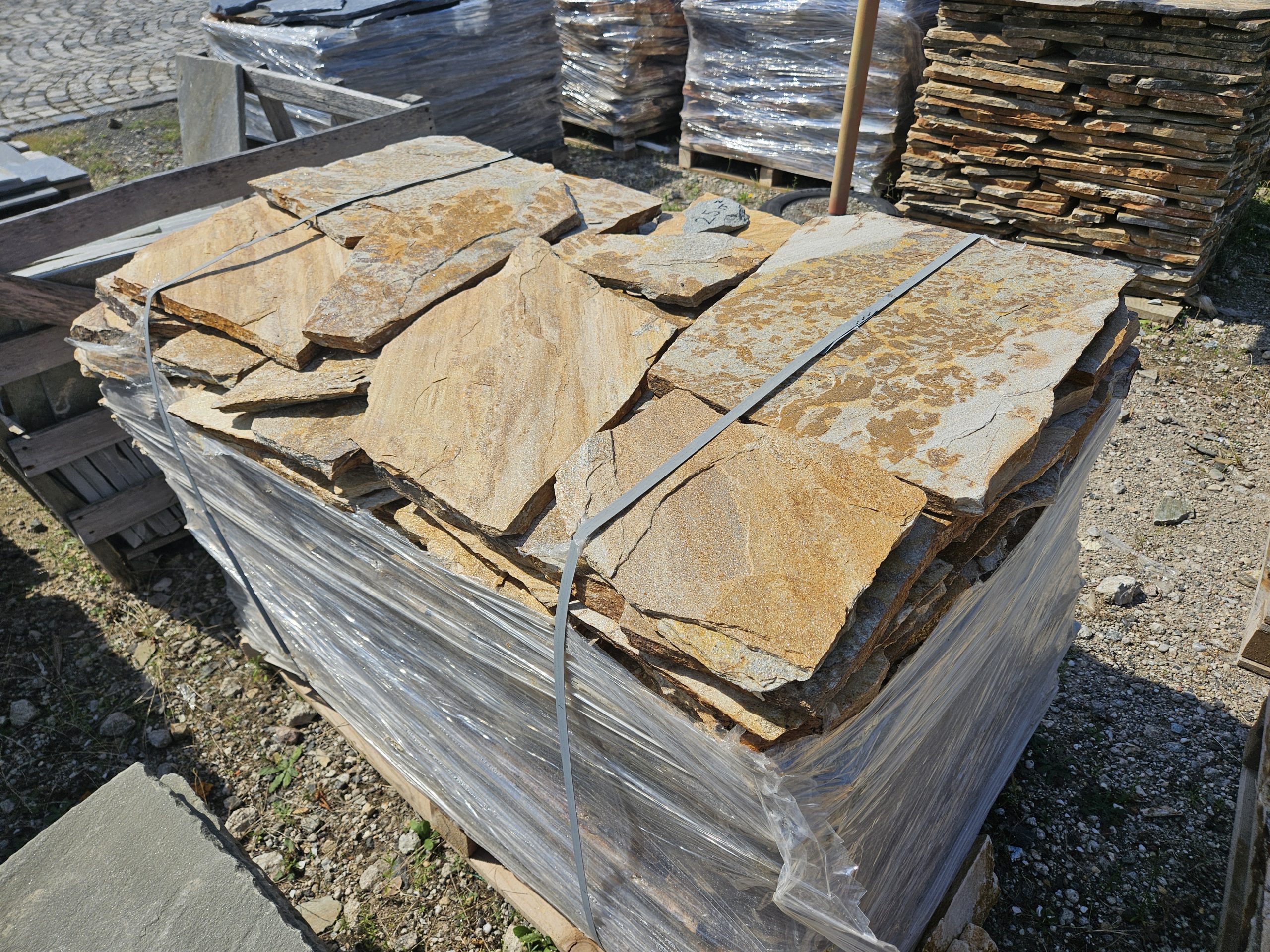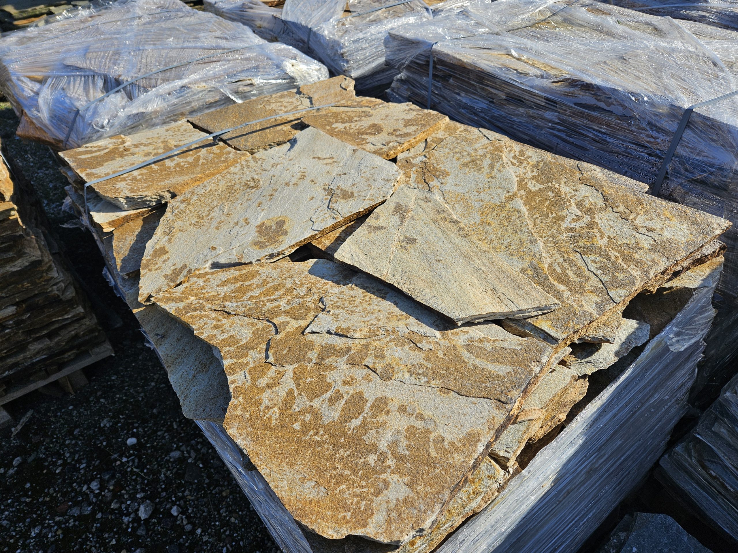 Golden Gneis Polygonalplatten können für Terrasse und Wege verwendet werden. Aber auch für den Innenbereich als Fussbodenbelag sind diese Gneis Polygonalplatten mit spaltrauher Oberfläche geeignet.