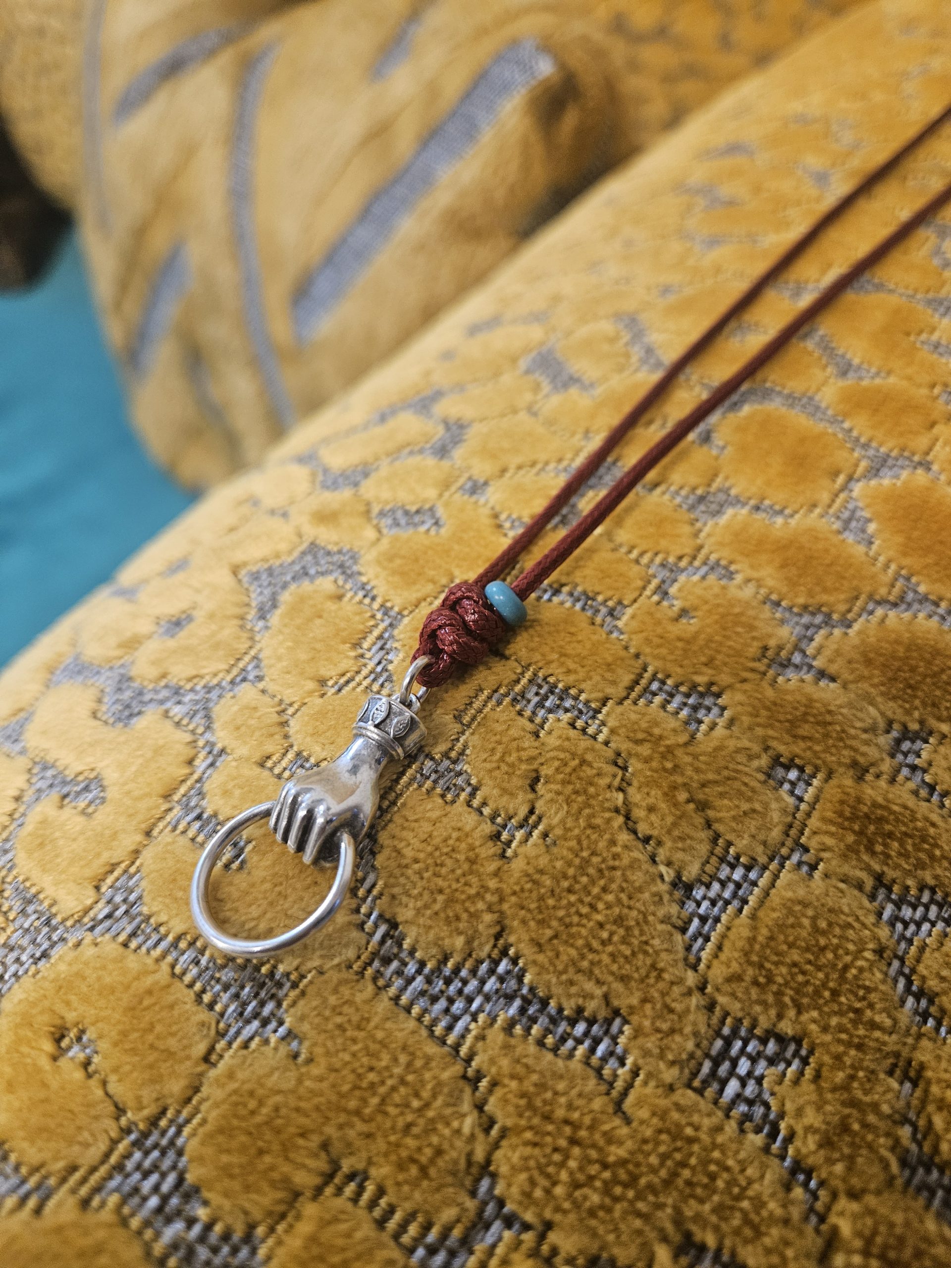 Handgefertigte Halskette Glückshand mit bordeauxfarbenem Band