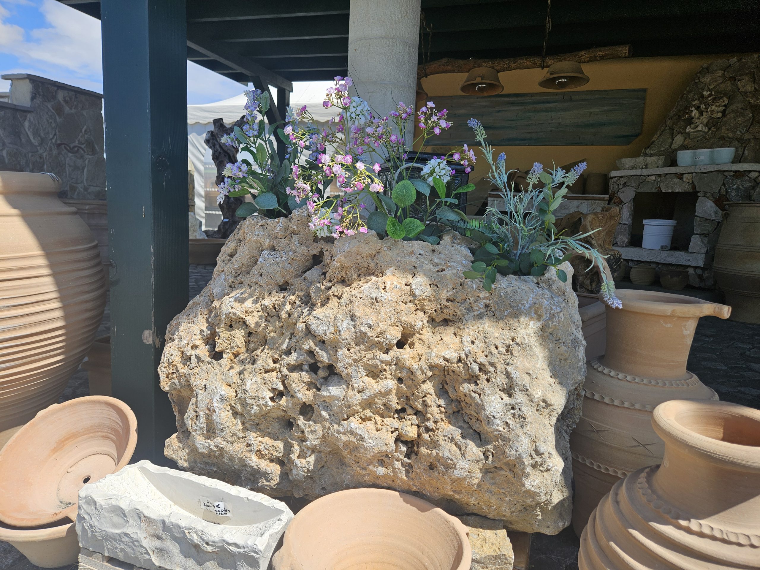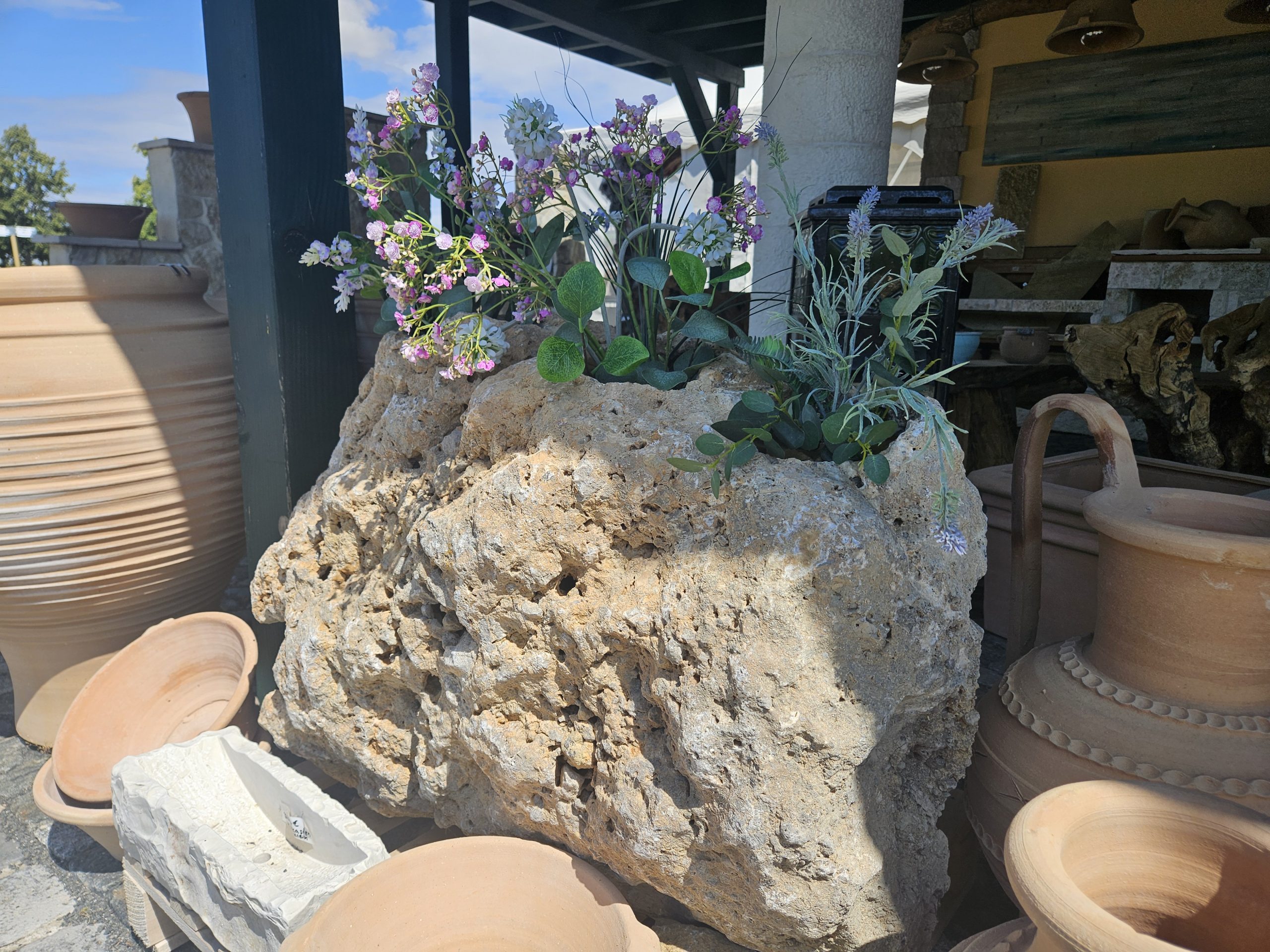 Der Pflanzstein aus Kalkstein besitzt drei Löcher zum Bepflanzen.