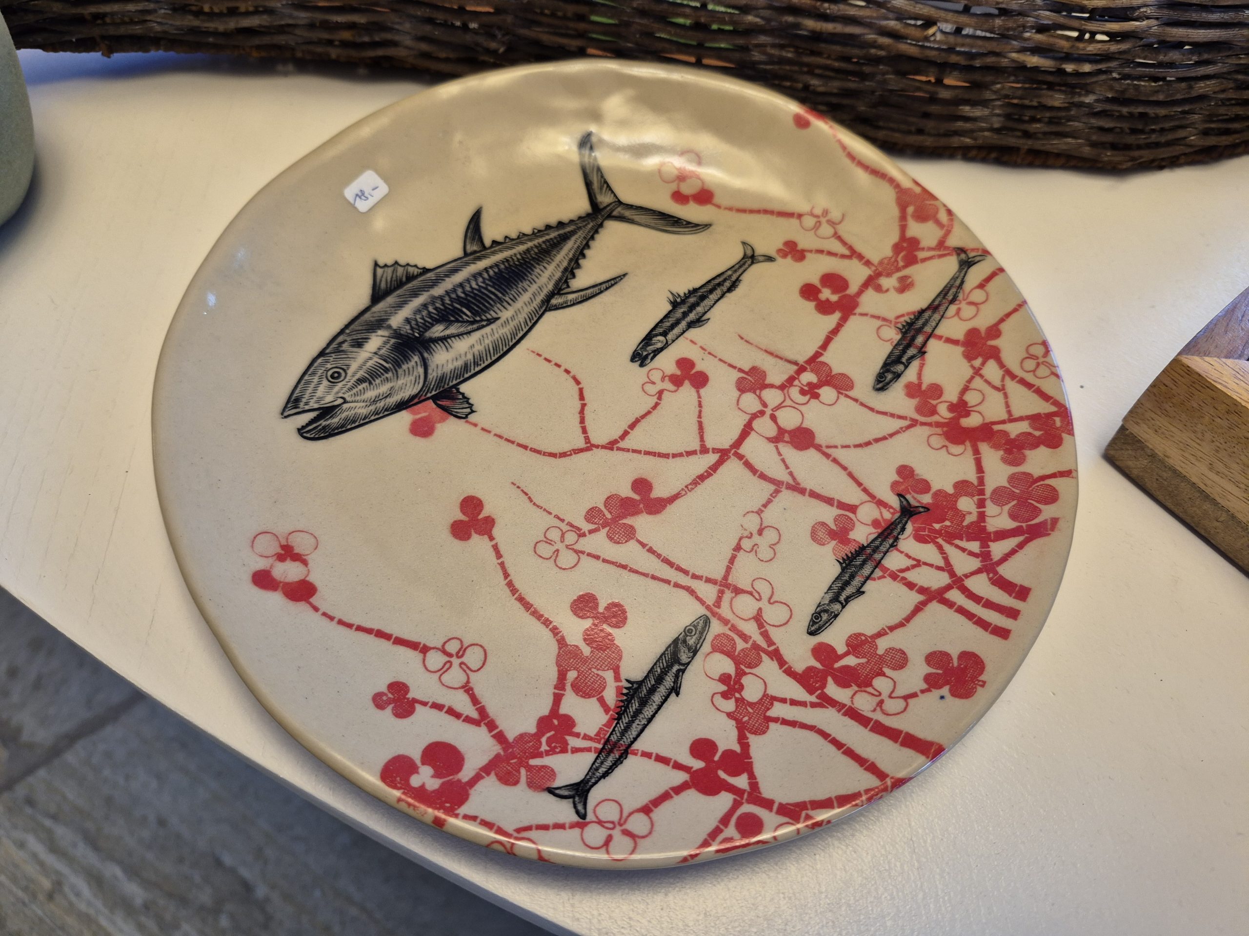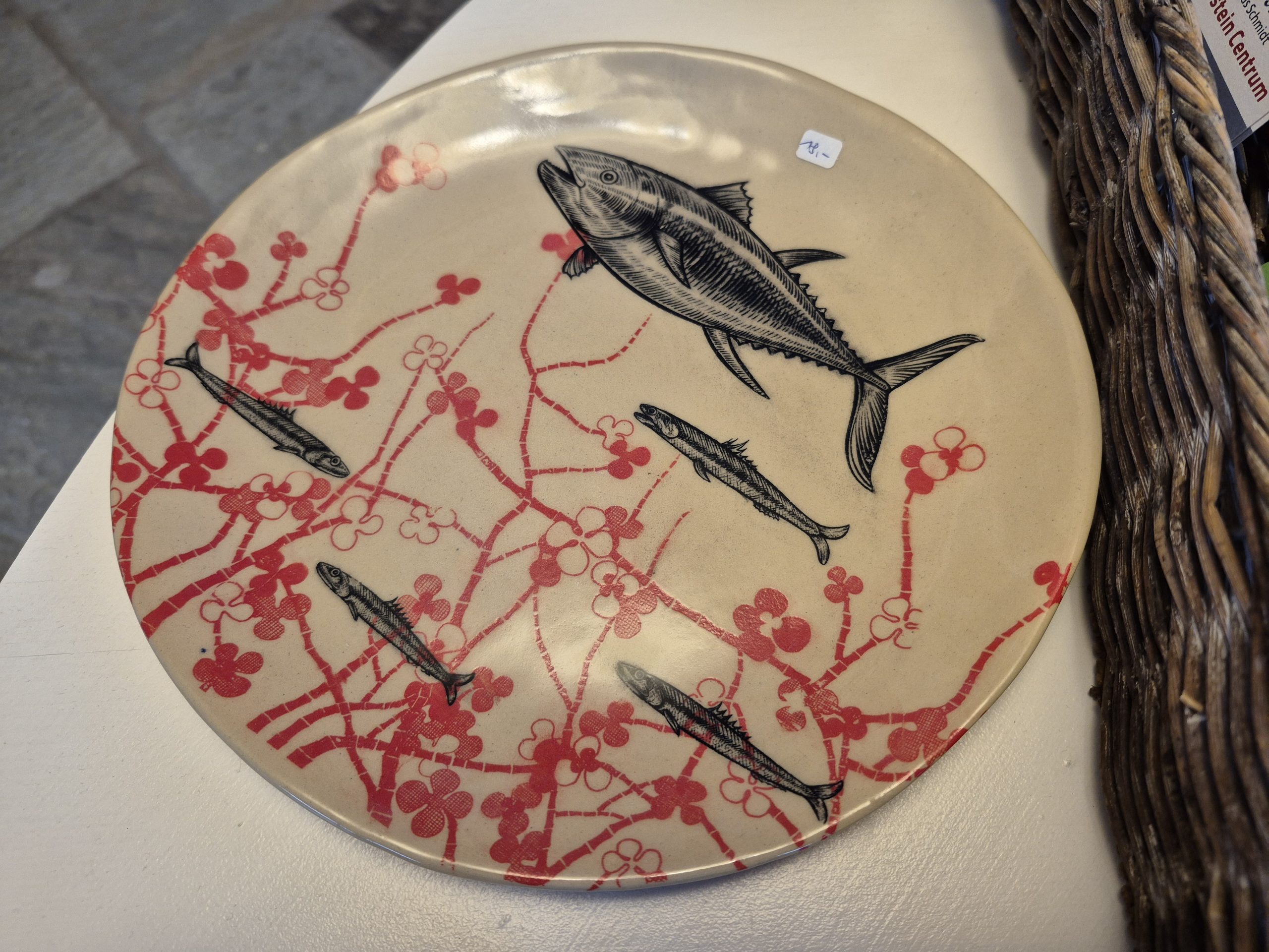 Der Teller mit den Fischen wurde in Handarbeit hergestellt. Er hat einen Durchmesser von etwa 23cm.