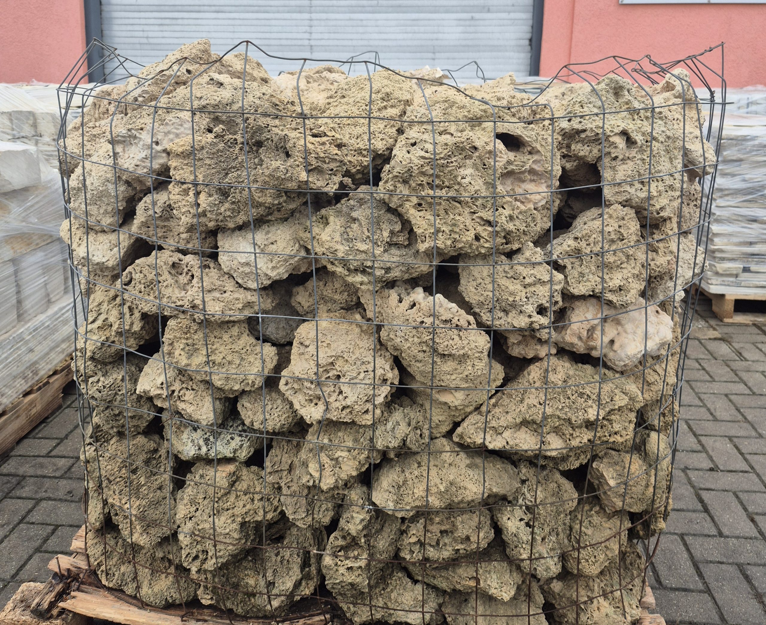 Die Tuffsteine, in verschiedenen Größen, kommen in einer Gitterbox zu ca. 850kg.